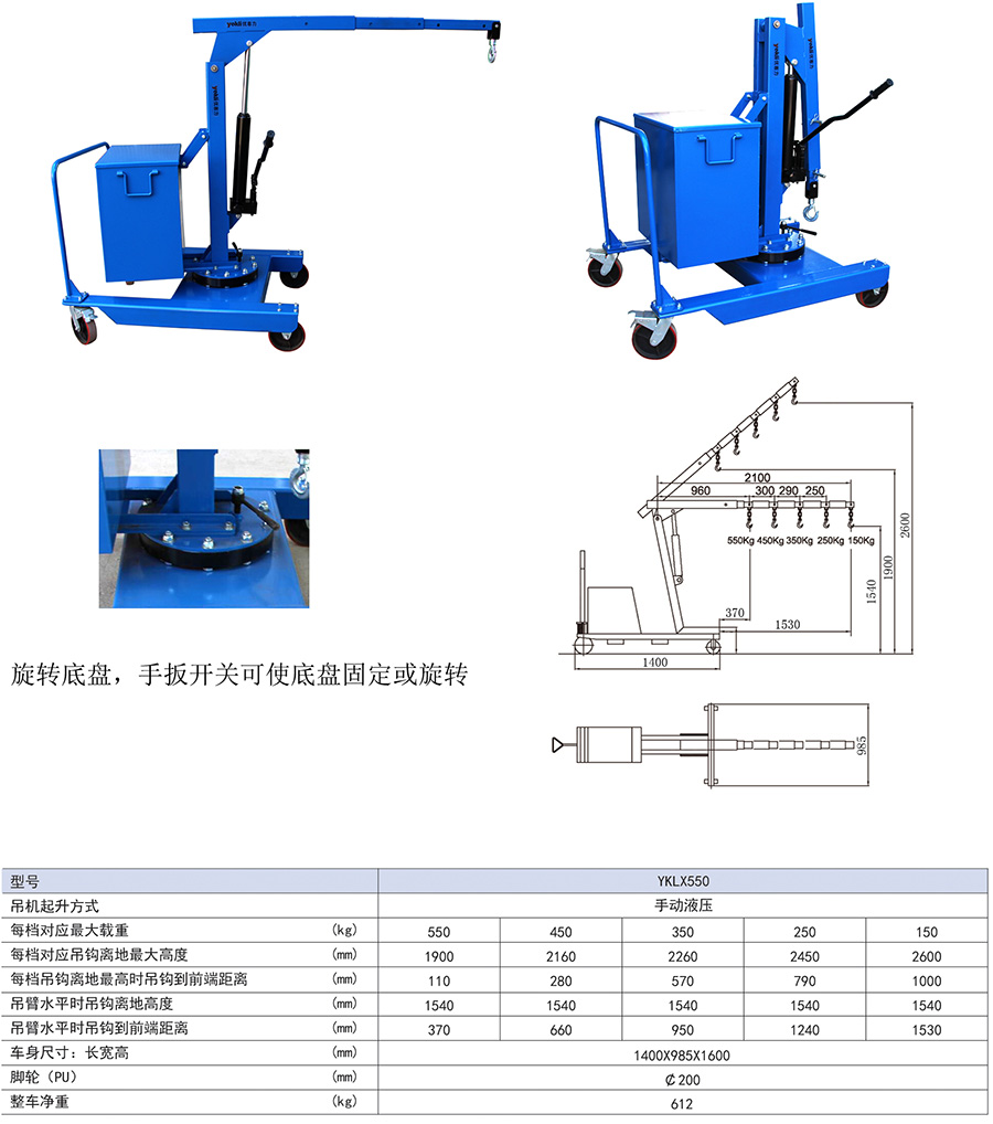 ● 吊臂長度可五工位手動調節配有鍛造重載可旋轉吊鉤。