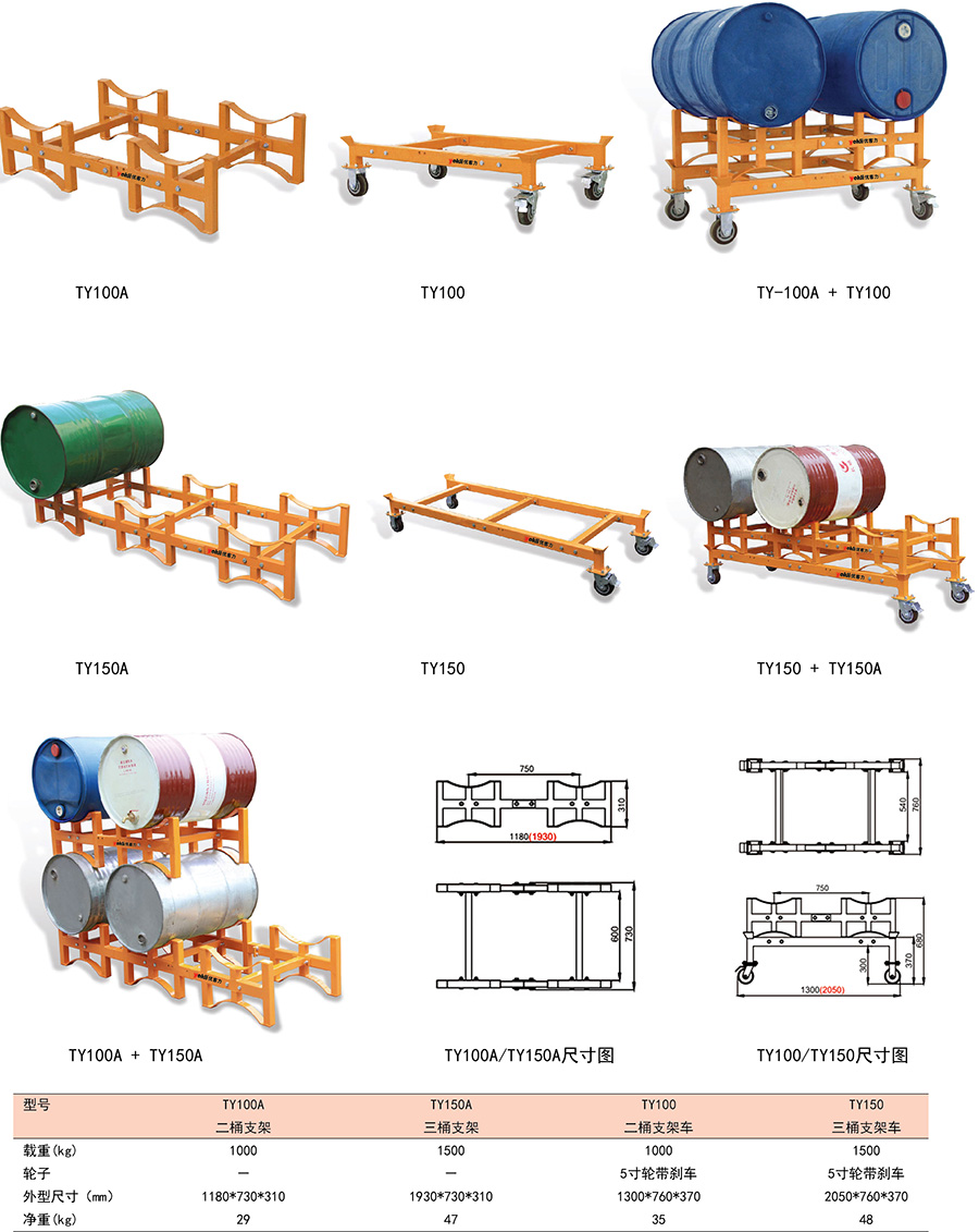 ● TY-100、TY-150為 帶輪子支架車,油桶支架放在上面可移動。